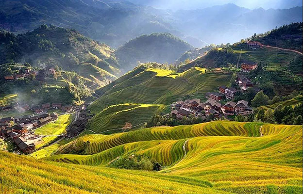 龙脊梯田风景名胜区位于广西壮族自治区桂林市龙胜各族自治县和平乡,国家AAAA级景区、全国农业旅游示范点。夜幕低垂,热情奔放的原生态歌舞晚会上演了,热情好客的村民身着节日盛装,与远方的客人跳起“大团圆舞”舞,人们沉浸在歌舞的海洋中,尽情欢歌狂舞。