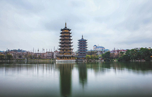 日月双塔是坐落于桂林市中心杉湖中的两座宝塔,日塔为铜塔,月塔为琉璃塔,两塔之间以湖底一条10多米长的湖底隧道相连。每到夜晚,两座塔在灯光映衬下分别散发着金银两色光芒,倒影在湖中的景象格外漂亮。