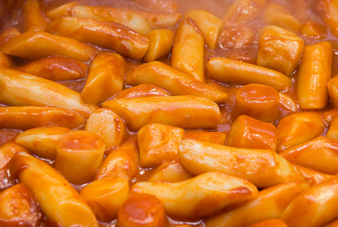 辣炒年糕是将细细长长的韩国年糕加上甜辣的辣椒酱炖煮而成,因为要一边翻炒,所以叫“炒年糕”,是韩国大众,特别是女性和小孩非常喜欢的一道小吃。在路边小吃摊或小吃店都能吃到。