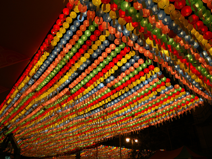 韩国燃灯会是纪念释迦牟尼诞生的大型庆典,随着庆典的到来,首尔到处都张灯结彩,挂满了五颜六色的莲灯,节日气氛非常浓厚。其中最大的看点是从东大门到钟路一带的“提灯游行”,10万韩国佛教徒总动员,提着莲灯游行。期间还有花车、穿着各式韩服的人们载歌载舞,场面非常壮观。除此以外,清溪川一带的传统灯展美轮美奂,是来韩国旅游感受韩国传统文化的最佳方式。