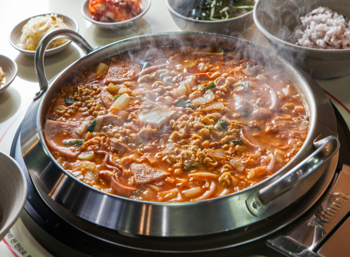 朝鲜战争以后,从美军流传下来一种放有午餐肉和脆皮肠的韩式火锅,据说这就是“部队锅”的原型,如今的部队锅,可以随意放入自己喜爱的食材,如泡菜、蔬菜、奶酪、年糕等等。因其多重的口感、十足的分量,深受年轻人的喜爱。