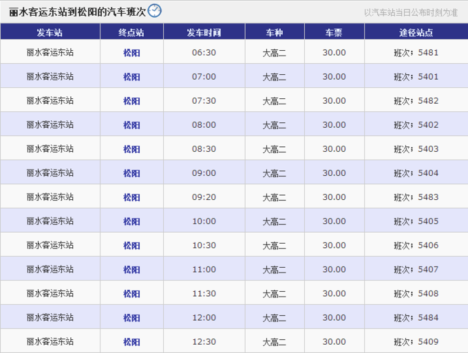 图:丽水客运东站到松阳汽车班次。