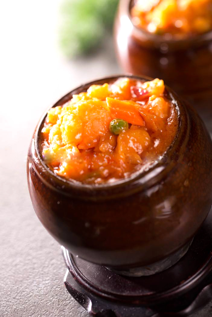 罐虾是一道俄罗斯系的菜肴,与红菜汤一样以西红柿做底料,再加上芹菜、胡萝卜等配料焖制成一罐浓郁虾肉。除了罐虾,还有罐牛、罐羊等,都是相同手法烹饪而成的。