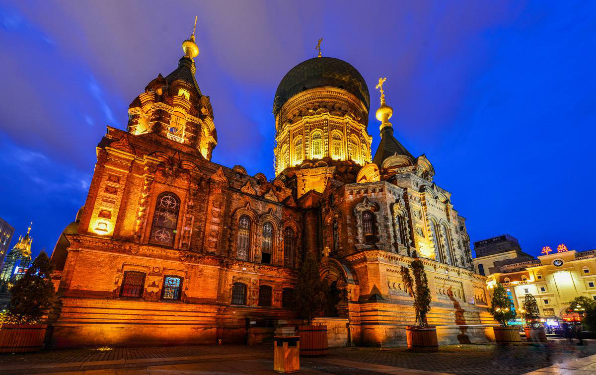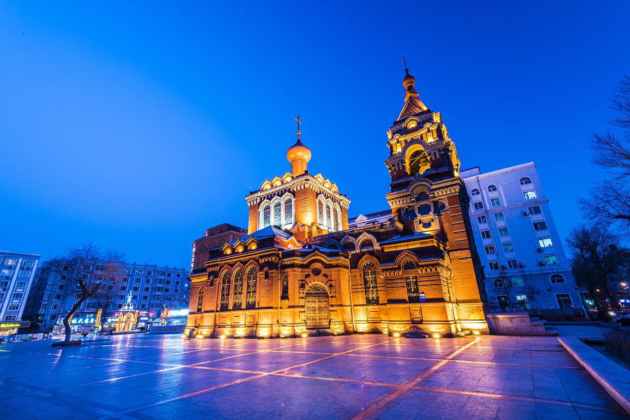 始建于1907年的圣索菲亚大教堂是哈尔滨的地标性建筑,绿色的洋葱头式大穹顶十分引人注目。这座宏伟的拜占庭式建筑已不再具有教堂的功能,与白天相比,教堂的夜景更美丽。圣·索菲亚大教堂曾经是远东地区最大的东正教堂,目前是中国保存最完整的拜占庭式建筑。