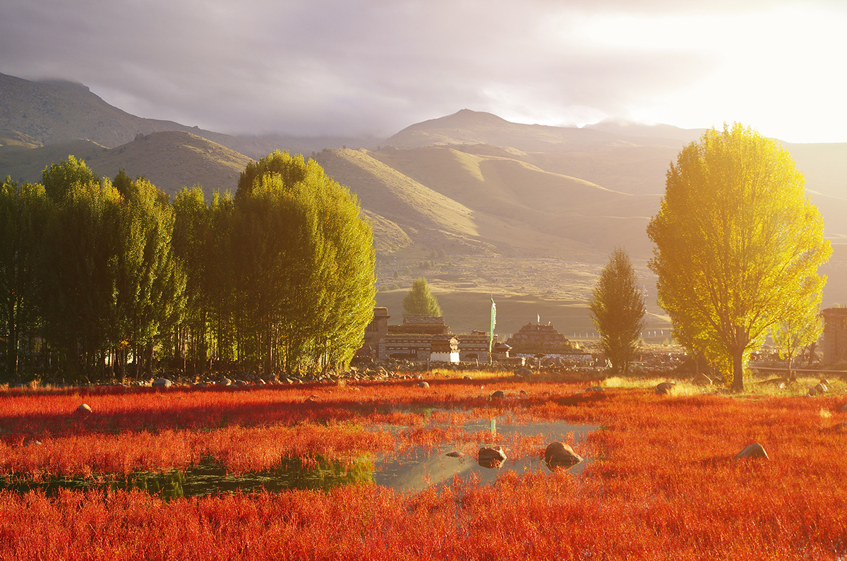 红草滩也被叫做红草地,位于桑堆乡境内,桑堆乡是典型的藏族村寨,乡寨中有一片足球场大小的湿地,每年9与下旬开始到10月初,湿地上的水草就会变红,如火焰般绚烂,这就是著名的红草滩,桑堆乡风景优美,藏式民居散落在辽阔的牧场中,伴着河水和起伏的远山,是川藏线上另一道美丽的风景。