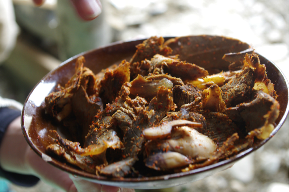 藏族喜欢吃风干牛羊肉,风干肉一般在冬天制作,牛、羊肉割下来后挂在阴凉处,让其冰冻风干。到了第二年三月后拿下来烤食或生食,味道鲜美,入口酥脆,可蘸椒盐粉或酱同食。