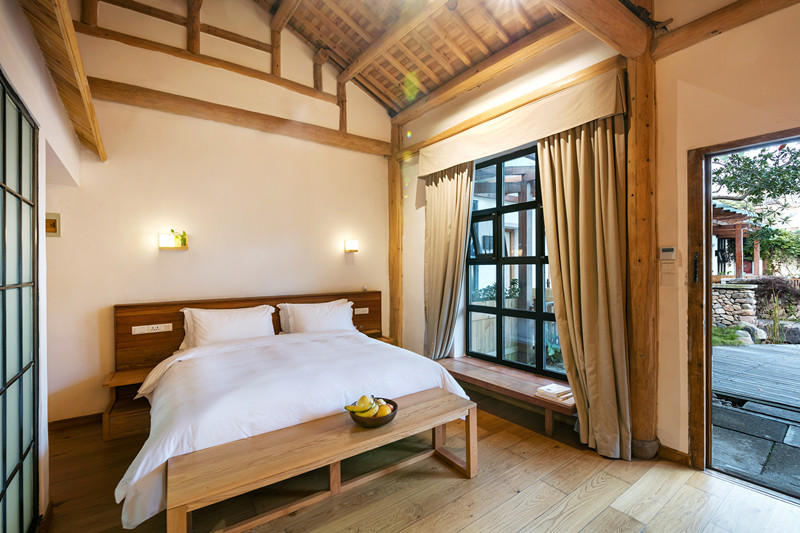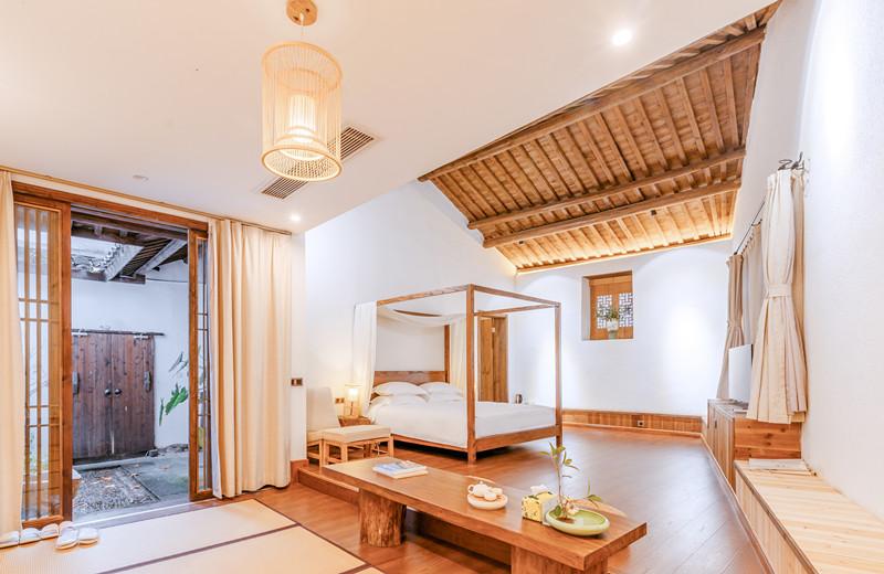 清新自然的客房,追求着极简和纯粹的体验,无需繁杂的装饰,书画点缀房间,促膝坐在茶座里,烹煮香茶一壶,与好友畅谈聊天,有庭院的景色相伴,宽敞的客房空间让旅居的的时光更加舒适自在。
