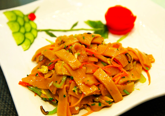 敲肉羹选材上好的猪夹心或后腿部位瘦肉,切薄片后通过敲打直至肉片呈薄饼状。锅内下豌豆,笋丁,香菇丁,豆腐丁等时鲜菜蔬翻炒几下后,加水和高汤,起大火将水烧至沸腾,下敲好的肉饼,然后倒入事先调好的番薯粉芡汁,边倒边搅拌,使之均匀分布,不粘锅底。再旺火滚上片刻,撒上香葱,香菜等,状似琼脂,色如琥珀,肉质脆嫩。
