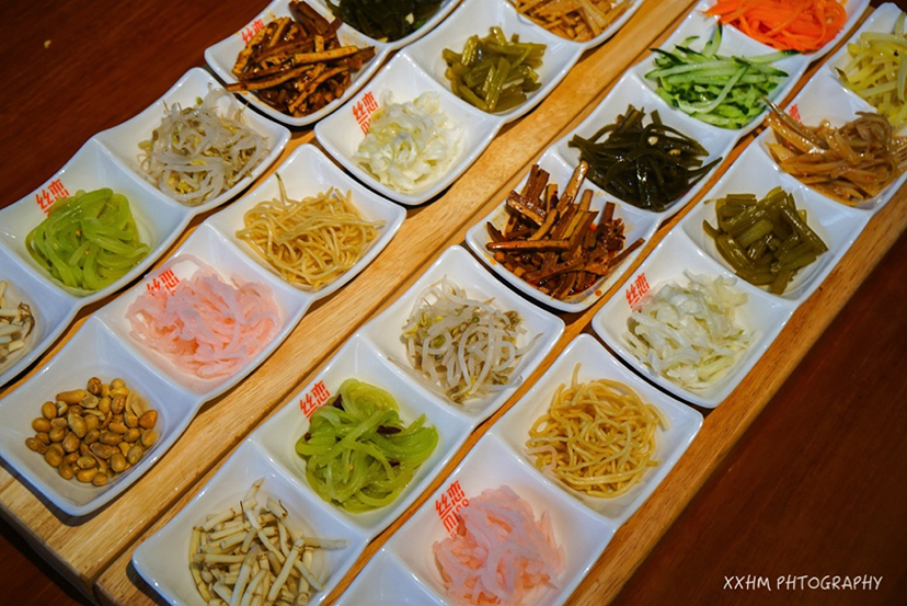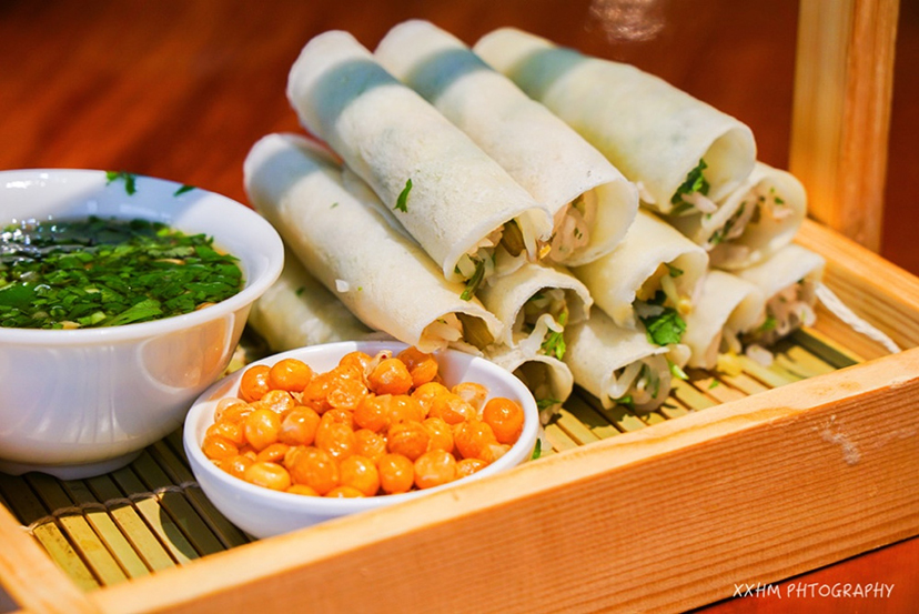 这道名字听上去就很可爱的菜品,却有着颇为“壮观”的排面。以面皮包裹住黄瓜丝、豆芽、青笋等蔬菜,蘸一点酸辣味的蘸水食用,“素春卷”的吃法酸辣爽口,五颜六色的菜码铺开摆放在一起,看起来更是赏心悦目。