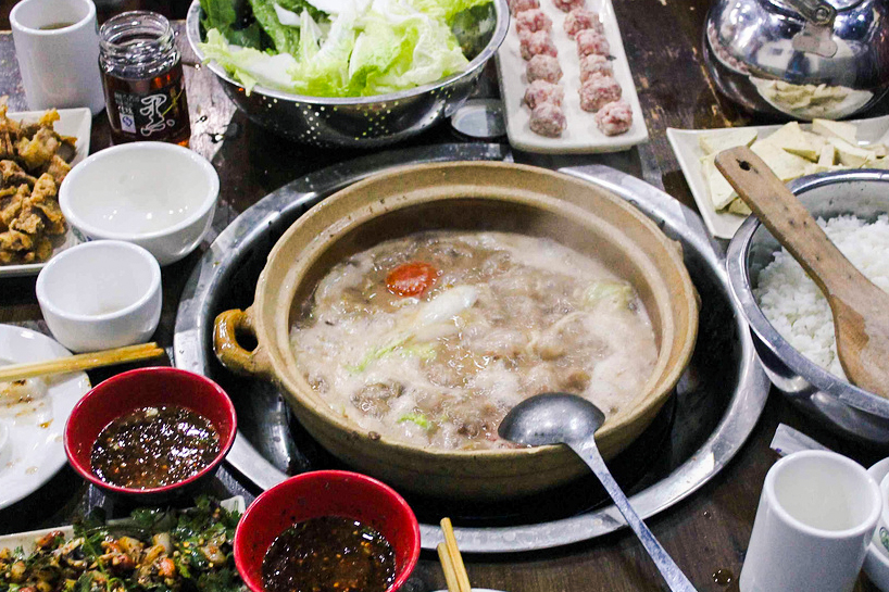 贵州人同样好吃火锅,但与其它地区的火锅不同,这里的豆米火锅以煮至软烂的芸豆为锅底,加入干五花肉、各种蔬菜,再以糟辣椒和西红柿调味。软糯的芸豆,浓稠的汤底,再涮上各式肉菜,令人爱不释口。