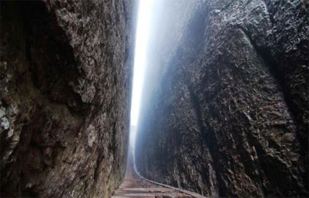 武夷山一线天位于武夷群峰的西南端,是武夷的最奇的岩洞。一线天,存在在九曲溪二曲南面的一个幽邃的峡谷中。里面一座巍然挺立的巨石,长数百丈,高千仞。岩端倾斜而出,覆盖着三个毗邻的岩洞:左为灵岩洞,中为风洞,右为伏羲洞。从伏羲洞而入岩内,到了深处,抬头仰望,但见岩顶裂开一罅,就像是利斧劈开一样,相去不满一尺,长约一百多米,从中漏进天光一线,宛如跨空碧虹,这就是令人叹为观止的一线天。
