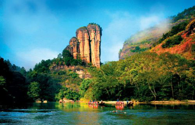 九曲溪发源于武夷山森林茂密的西部,水量充沛,水质清澈,全长62.8公里,流经中部的生态保护区,蜿蜒于东部丹霞地貌,分布峦岩壑间和深刻的断裂方向控制下,形成深切河曲,在峰峦岩壑间萦回环绕,9.5公里的河曲,直线距离只有5公里,曲率达1.9公里。九曲溪两岸是典型的单斜丹霞地貌,分布着36奇峰、99 岩,所有峰岩顶斜、身陡、麓缓,昂首向东,如万马奔腾,气势雄伟,千姿百态。优越的气候和生境,又为群峰披上一层绿装,山麓峰巅、岩隙壑嶂都生长着翠绿的植被,造就了“石头上长树”的奇景,构成了罕风的自然山水景观。