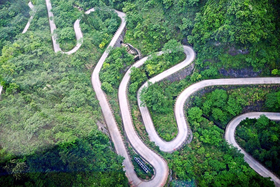 通天大道是这里的另一不可错过的看点。这条仅有10公里的盘山公路,却有着99道几近180度折返的发卡弯,而短短10公里内,公路的海拔高度也从200米直接升至1200米。陡峭的山路禁止游客自驾,只允许景区内的电瓶车通行,而从山顶或缆车上向下望去,曲折盘旋的公路完整展现眼前,无疑是通天大道最令人惊心动魄的场景。