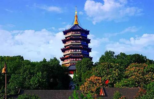 雷峰塔是中国首座彩色铜雕宝塔。又称西关砖塔。每当夕阳西下,塔影横空,别有一番景色,雷峰夕照为西湖十景之一。雷峰塔也因《白蛇传》中禁锢白娘子的传说而闻名遐迩。雷峰塔的建设在中国风景保护和建设史册上留下了四项“天下第一”:塔类建筑采用钢材框架作为建筑支撑、承重主体的天下第一。塔类建筑中采用铜件最多、铜饰面积最大的天下第一。塔类建筑内部活动空间最宽敞的天下第一。塔类建筑内部文化陈设最丰富的天下第一。