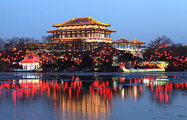 它是在原唐代芙蓉园遗址以北,仿照唐代皇家园林式样重新建造的,是中国第一个全方位展示盛唐风貌的大型皇家园林式文化主题公园,占地面积一千亩,其中水域面积三百亩。园内建有紫云楼、仕女馆、御宴宫、杏园、芳林苑、凤鸣九天剧院、唐市等许多仿古建筑,是中国最大的仿唐皇家建筑群。