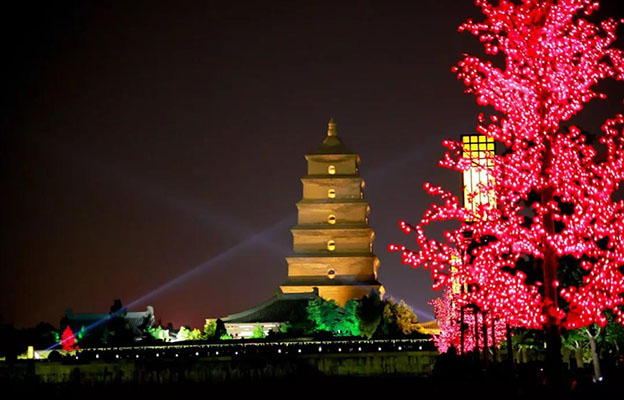 大雁塔——玄奘藏经之处,大雁飞过,落地而亡,古人以雁为神鸟, 故名大雁塔。大雁塔是全国著名的古代建筑,被视为古都西安的象征。大雁塔在唐代就是著名的游览胜地。现在,那里有亚洲最大的音乐、灯光喷泉,气势磅礴;有错落有致的仿唐建筑群,大气宏伟,让人联想到盛唐时期的长安城;有风趣幽默、表现关中大地风土人情的雕塑;有小桥流水、一派诗情画意的园林景观。大雁塔是西安的骄傲,是游人必游的景点。