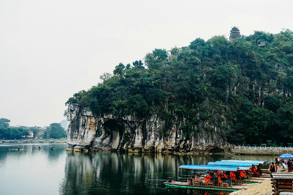 象鼻山是桂林的“城徽”。其山体酷似一头沿江饮水的大象,而“象鼻”与“象腿”之间的空隙,因漓江水面的倒影而形成了“象山水月”的奇景,搭乘两江四湖游船,便可直接在漓江上看到。此外,象鼻山景区内另有水月洞、普贤宝塔等,也是本地颇具历史感的观赏点。