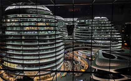 已故建筑界的女魔头,2004年普利兹克奖获得者,扎哈哈迪德遗留作品之一—银河SOHO。二环东北角的标志性建筑,北京方形城市网格中的规则破坏者。一组找不到弯角的建筑群,夜幕降下之后,置身其中犹如在流水中前行,于丝带间行走。夜晚站在廊桥上仰望天空,连绵不断的曲线将北京的夜空挥舞成梵高的《星月夜》。