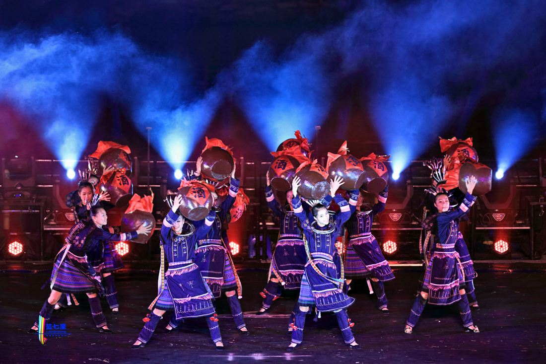 《水韵樟江》以山水实景舞台表演的形式,通过布、水、苗、瑶四个版块多维立体化的表演形式,结合现代化音乐、灯光、布景等资源,呈现出荔波县少数民族的淳朴、自然、神秘、古朴。