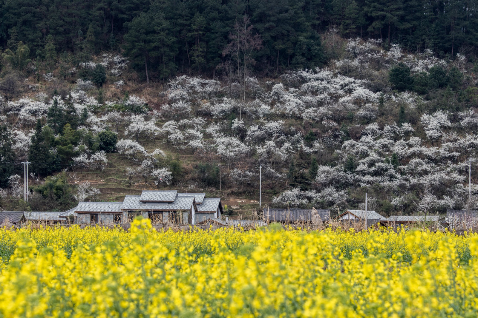 金海雪山景区主要以郁金香、风信子、冰岛虞美人等几十余种鲜花形成的花海组成,没到春天,万亩金黄的油菜花好似金海,千顷雪白的李花、梨花就像雪山,交相辉映,如“金海雪山”,景区内的音寨村是有着600多年历史的布依族村寨,被称为“中华布依第一寨”。