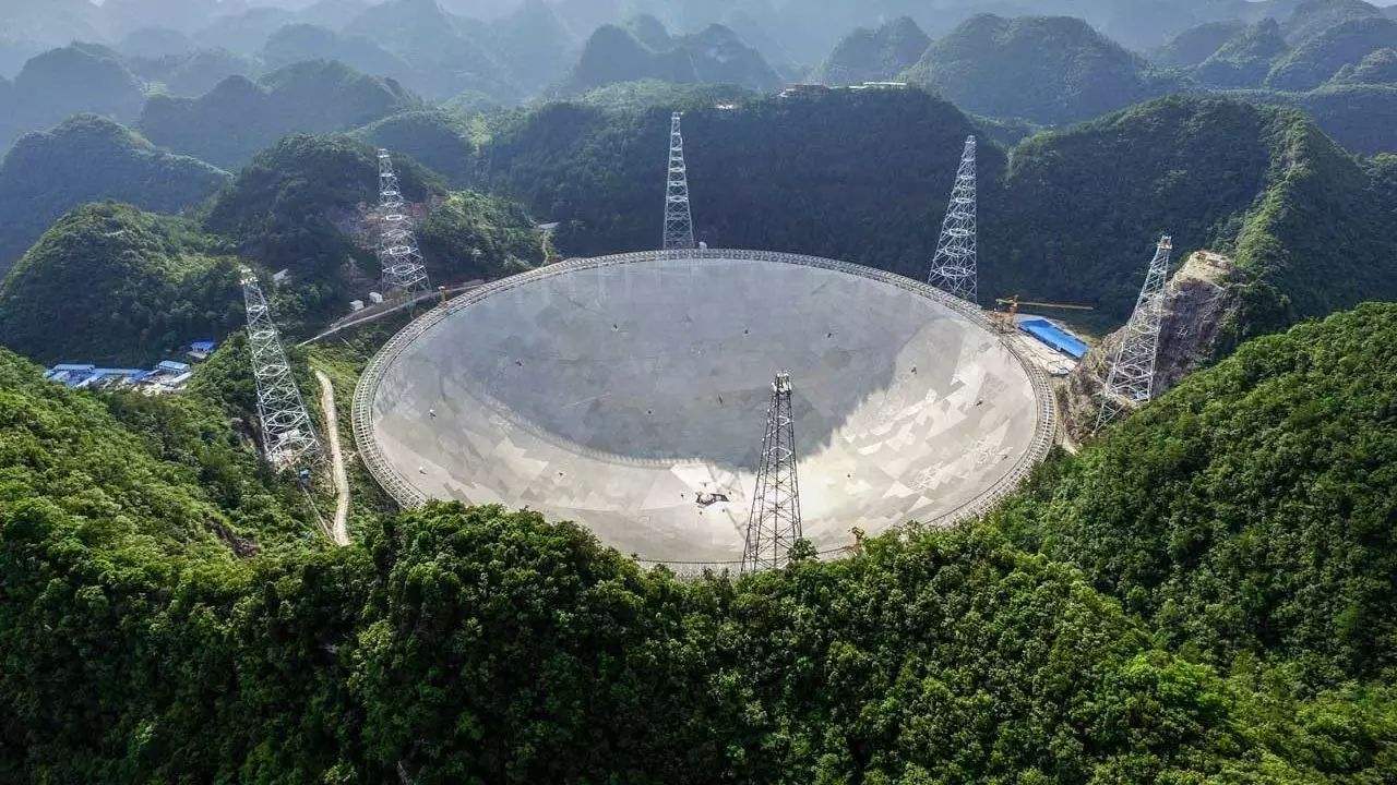 中国天眼是世界最大的单口径球面射电望远镜,于2016年正式投入使用,望远镜口径有500米,有近30个足球场大的接收面积,主反射面的面积达25万平方米。只有真正走近中国天眼,才能感受到这个人工建筑的广阔与巍峨,惊叹人类的巧夺天工。