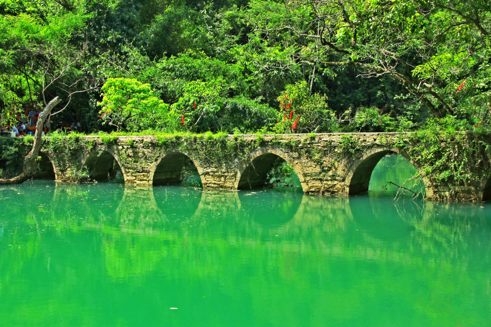 小七孔风景区因响水河上横跨着一座青石砌成的七孔拱桥而得名。景区融山、水、林、洞、湖泊和瀑布为一体,秀美幽静。水上森林是拍摄风景大片的好地方,卧龙潭宛若人间仙境。鸳鸯湖湖水碧绿凝重,因湖中有两棵并排参天的大树而得名,游玩景区时,还可以在景点旁的商摊前买烤玉米、炸小鱼和茶叶蛋等小食来吃。