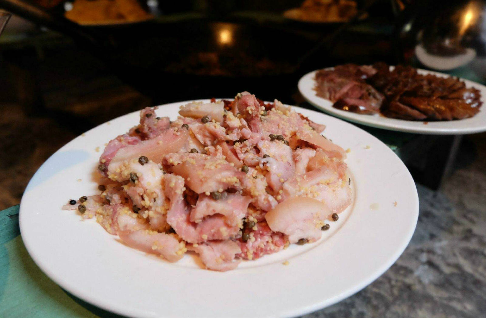 荔波酸肉历史悠久,在荔波几乎家家都有坛子,腌有酸肉,特别是夏天,一小碟酸肉放桌上,荤食油腻之时夹一块放进嘴中,细细嚼之,顿感清酸。“熟”了的腌肉,肥肉呈乳白色,瘦肉呈暗红色。腌酸肉取出便可食,若在食用时蘸一些干辣椒粉,其味更佳。