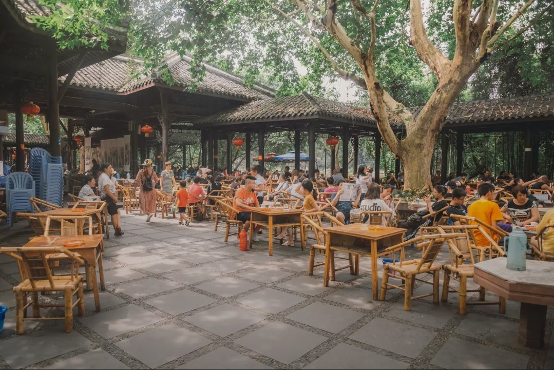 在人民公园喝茶的人,有的摆龙门阵、有的晒着太阳,好不热闹!可以选择去著名的鹤鸣茶社喝碗盖茶,点些瓜子花生,静静感受当地人的慢生活;