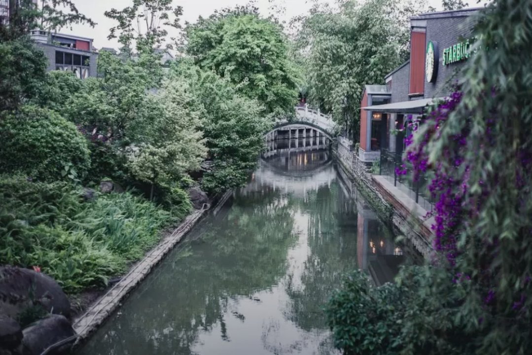 铁像寺水街不似宽窄巷子、锦里古街那样出名,但主打的“水文化”与佛文化的融合,使这里成为了解老成都历史的窗口之一;地标建筑“回澜塔”,到夜晚被灯光照亮,倒映在肖家河上,十分典雅唯美;这里是成都人休闲娱乐的诗意场所,喝盖碗茶、晒太阳、摆龙门阵、掏耳朵,很多人一待就是一下午。