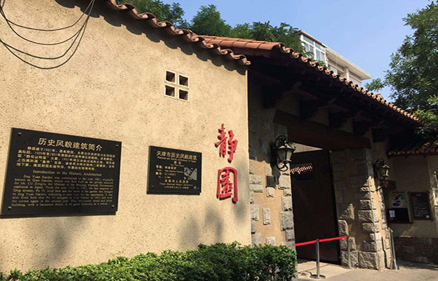 静园初名乾园,为北洋政府驻日公使陆宗舆宅邸。1929年7月—1931年11月,末代皇帝溥仪居住于此,更名“静园”,寓意“静以养吾浩然之气”。园内建有折中主义砖木结构楼房一座,融西班牙式和日式风格于一体,草木葱郁,静谧宜人,是天津租界时期庭院式私人宅邸的典型代表。静园为三环套月式三道院落,即前院、后院和西侧跨院。前庭院建有西班牙式二层(局部三层)砖木结构主楼一座,西半部为通天木柱的外走廊,东半部为封闭式。一楼恢复大餐厅、小餐厅、会议室、会客室、文绣卧室等;二楼恢复祠堂,溥仪和婉容的书房、寝室等。楼内装修非常讲究,主要房间均配置护墙板、壁橱、博古架、书架等,装饰风格均为依照溥仪研究专家的考证精心挑选,使游客身临其境,真实的体会到上世纪的那段岁月。复原陈列展品依据当初摆设,以清末民初的老家具、饰品为主,具有当时的时代特征。辅助陈列主要收录与溥仪及静园有关的器物,以及相关文字、照片资料等,以展示溥仪在津的生活和政治活动全过程。静园主体建筑属于折衷主义风格,带有日本木构建筑特点和西班牙建筑的样式。