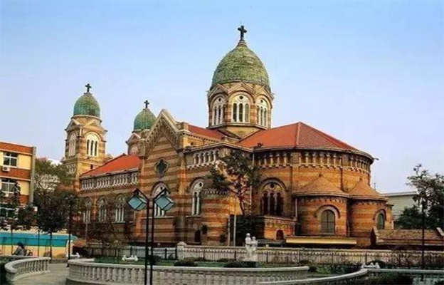 西开教堂是天津市最大的罗马式建筑,也是天主教天津教区的主教座堂(西开教堂是主教府,但没有主教)。西开教堂建筑主体是用红黄色花砖砌造的,教堂内有许多壁画和大管风琴,前面院中有圣水坛,有左右两道大门,信徒分男女从不同的门入内。西开教堂的结构是带厢堂长殿式,教堂横殿和长方形教堂相交构成十字连拱廊。大门采用拱门形式,通常用石头做材料,在石门上凿出一个拱卷,一个套一个拱卷由表入里,一个比一个小,最里层式木制大门。室内八角形的穹窿顶及侧窗均以彩色玻璃嵌作画。内墙彩绘壁画,装饰华丽,充满宗教神秘气息。西开教堂教堂入口左右筑有塔楼。