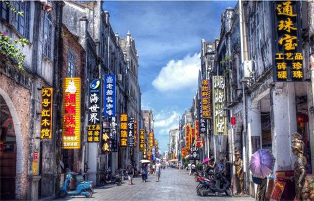 北海老街——珠海路是一条有一百多年历史的老街,始建于1883年,长1.44公里,宽9米,沿街全是中西合璧骑楼式建筑。这些建筑大多为二至三层,主要受19世纪末叶英、法、德等国在我市建造的领事馆等西方卷柱式建筑的影响,临街两边墙面的窗顶多为卷拱结构,卷拱外沿及窗柱顶端都有雕饰线,线条流畅、工艺精美。临街墙面部不同式样的装饰和浮雕形成了南北两组空中雕塑长廊。