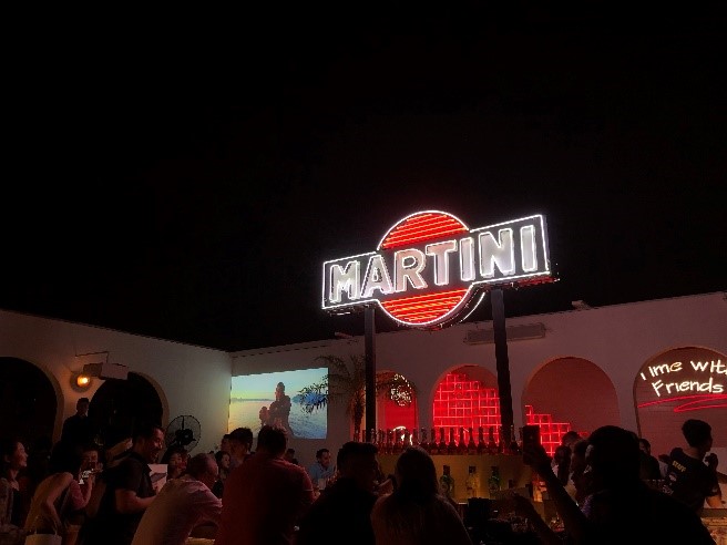 位于那里花园的顶层露台,隐藏着一个时尚的露天酒吧,整个酒吧的风格感觉是建在沙漠绿洲中,有种狂野时尚的美国风情。白色的拱形门边,两颗椰林棕榈树,满满的夏日悠悠。红蓝色霓虹灯牌的Martini在黑夜中格外耀眼,也仿佛是伫立在城市中的一朵沙漠之花。背靠三里屯南区而坐,回头就是闪烁的洲际灯光,热情的音乐,迷人的夜景,再来上一杯特调的鸡尾酒,沉醉在三里屯的流光溢彩中。