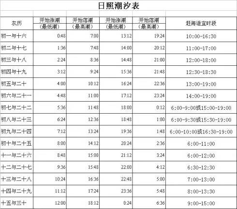 赶海要等到潮落的时候去,并且一定要记得在涨潮之前退出来,不然可能会遇到危险。下面这张图是日照的潮汐涨落时间表,是按照农历(阴历)计算的,每天的潮汐两起两落。