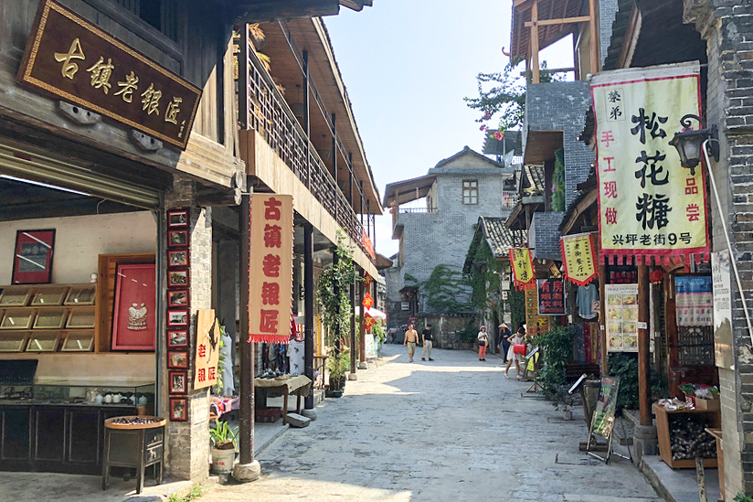 相比于热闹非凡的阳朔西街,位于阳朔县城以北的兴坪古镇显得低调不少,但人民币20元纸币背面的漓江山水,也正是在此取景。被称为“漓江上的一颗明珠”,兴坪古镇的历史可追溯至三国时期,古城墙和老房子的粉墙黛瓦,在此都有完整的保留。而走出镇外,壮丽的山水美景便豁然出现。