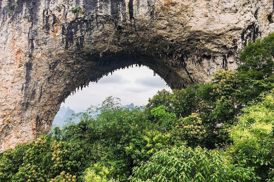 月亮山可谓是阳朔的一大奇景:高耸山崖上的天然石拱,远远看去如一轮明月高悬,因此得名月亮山。登上800多级的石阶,便可近距离看到石拱内的模样:顶部挂满形态各异的钟乳石,两侧内壁光滑,造型奇特。