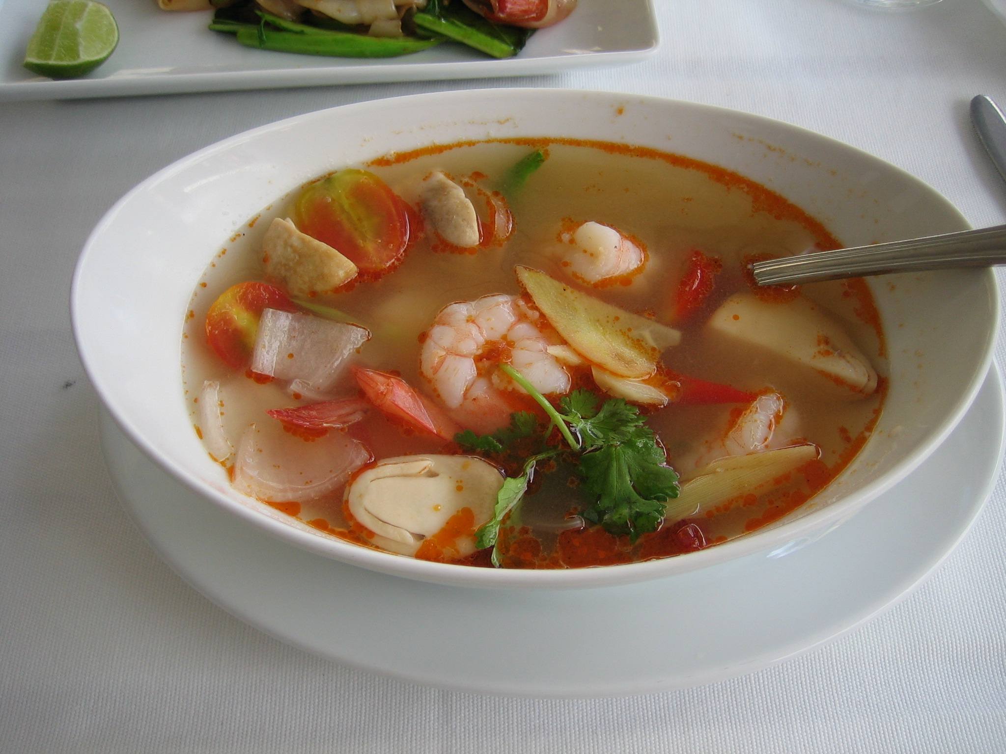 冬阴功汤主要食材有柠檬叶、香茅、虾等,放入泰国特有的几味香料,集合了酸辣甜咸和浓浓的香料味道,是泰国当地最普遍的一道汤品。