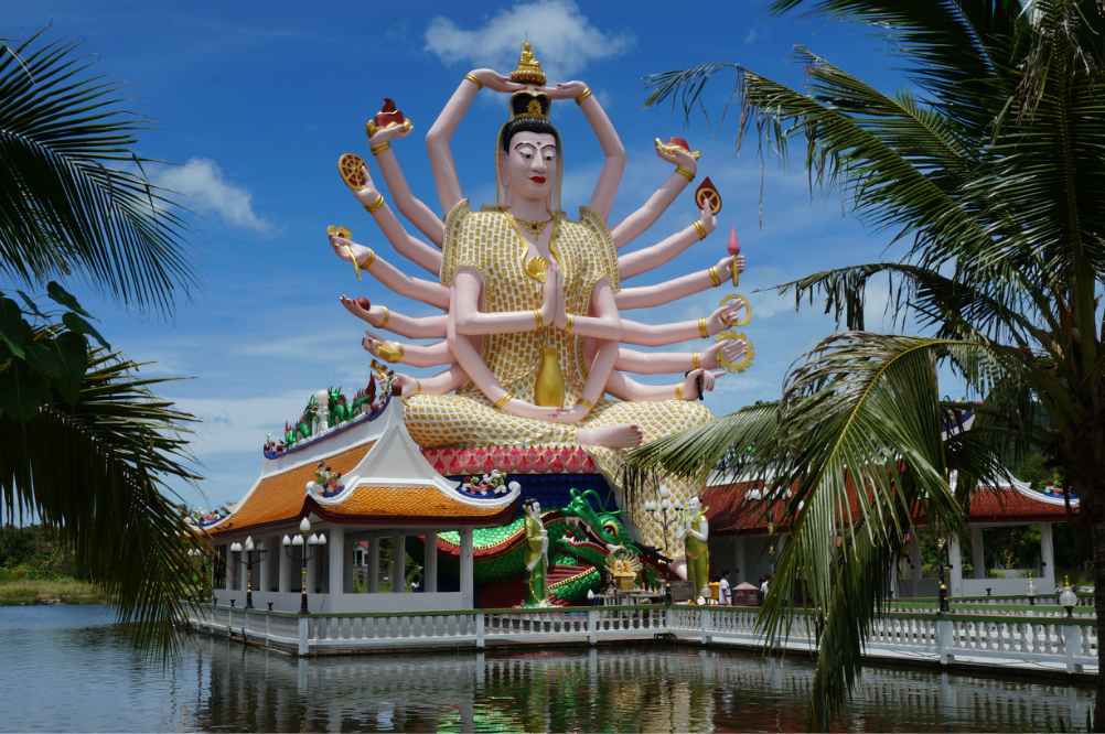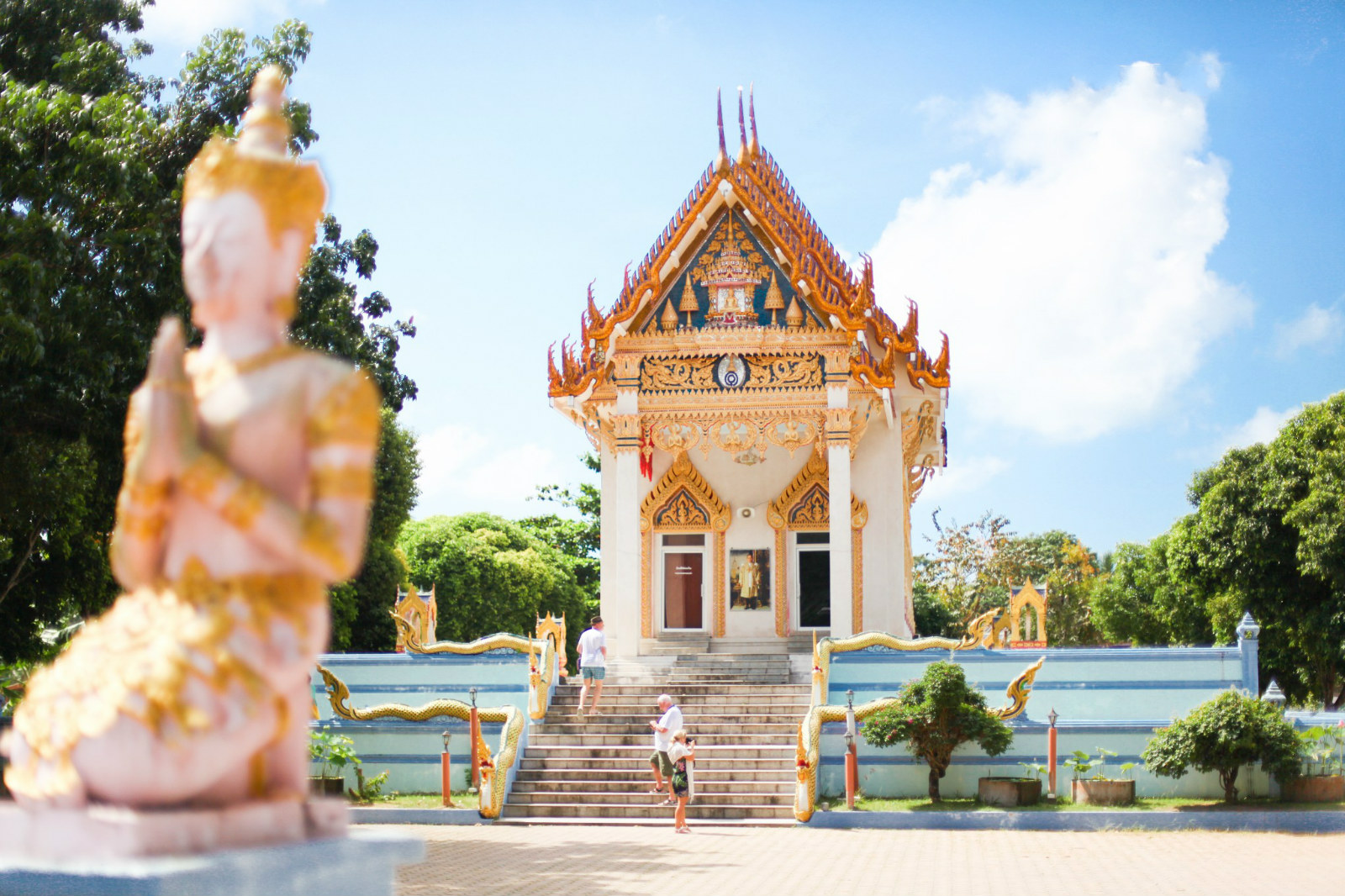 大佛寺也叫帕雅寺,因寺内有一尊15米高的金色大佛像而闻名,是苏梅岛的地标建筑,寺庙位于芬岛(Koh Fan)上,靠近邦来克海滩(大佛海滩),寺庙建于山顶之上,登高望远,四周海域和附近小岛尽收眼底,景色迷人。