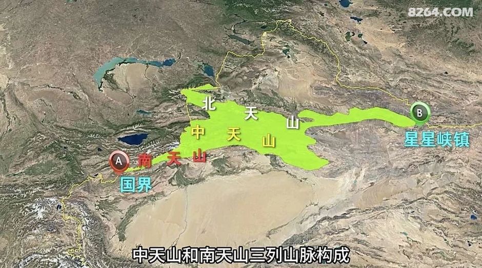 天山南北平均宽250-350公里,呈东西走向,在中国新疆境内绵延1700公里,占新疆全区面积约1/3。天山大致由三列平行的山脉组成,分为北天山、中天山和南天山,它把新疆一分为二,以天山为界,就有了北疆和南疆之分。南天山西端延入哈萨克斯坦和乌兹别克斯坦境内。