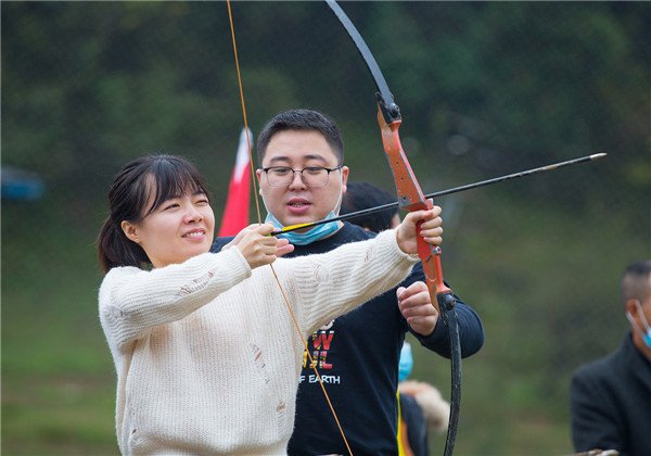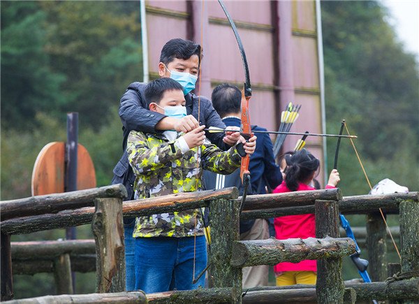 “举起弓后,高度要与眼睛持平,同样让眼睛、弓的准星、射靶的黄心连成一条直线!”在射箭场同意一样人气满满,在欣赏美景的同时,集力量平衡与耐心毅力的射箭项目,激发了不少孩子的竞技乐趣,射中靶心欢呼雀跃,即使脱靶也获得父母鼓励,体验感满满的项目收获欢笑声一片。