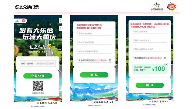 中奖市民只需打开微信扫描中奖兑换窗口,得到景区门票兑换码;然后扫描门票兑换窗口,填写相关信息并预约好游览时间,即可游览世界自然遗产地的神奇魅力。