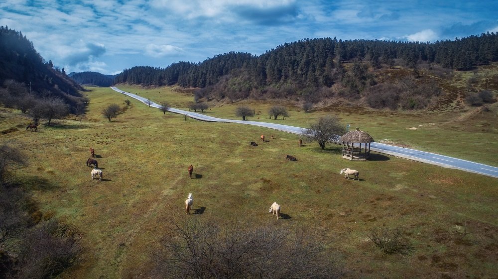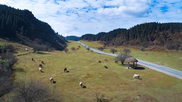 秋季的仙女山牛马成群,原生态公路延绵到天际。