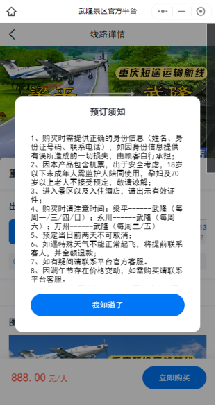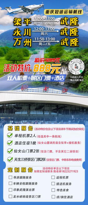 为庆祝短途运输航线的开通,华夏飞滴与武隆景区联手推出了一系列诱人的优惠活动。旅客只需888元(端午期间加价50元)就能享受到双人机票+景区门票+酒店的超值组合优惠,详细如下:888元(端午期间加价50元)即可购买双人单程机票(三个航线选择其一)+仙女山云端民宿一晚(含双早+接机服务)+仙女山景区门票两张(不含景区二销项目)+天生三桥景区门票两张(含中转车和电梯)。