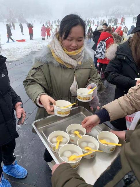 景区工作人员为游客送上暖心姜汤