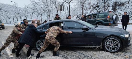 公司女子民兵连帮助误入支路车辆打滑的游客推车