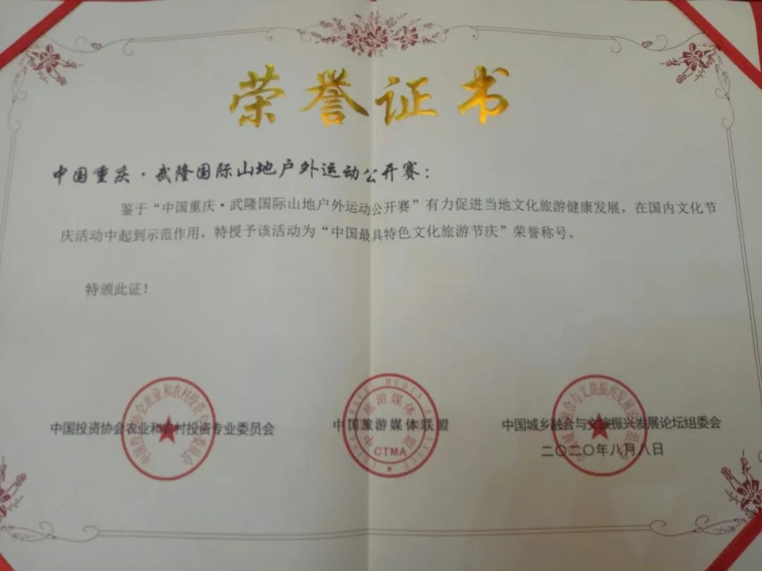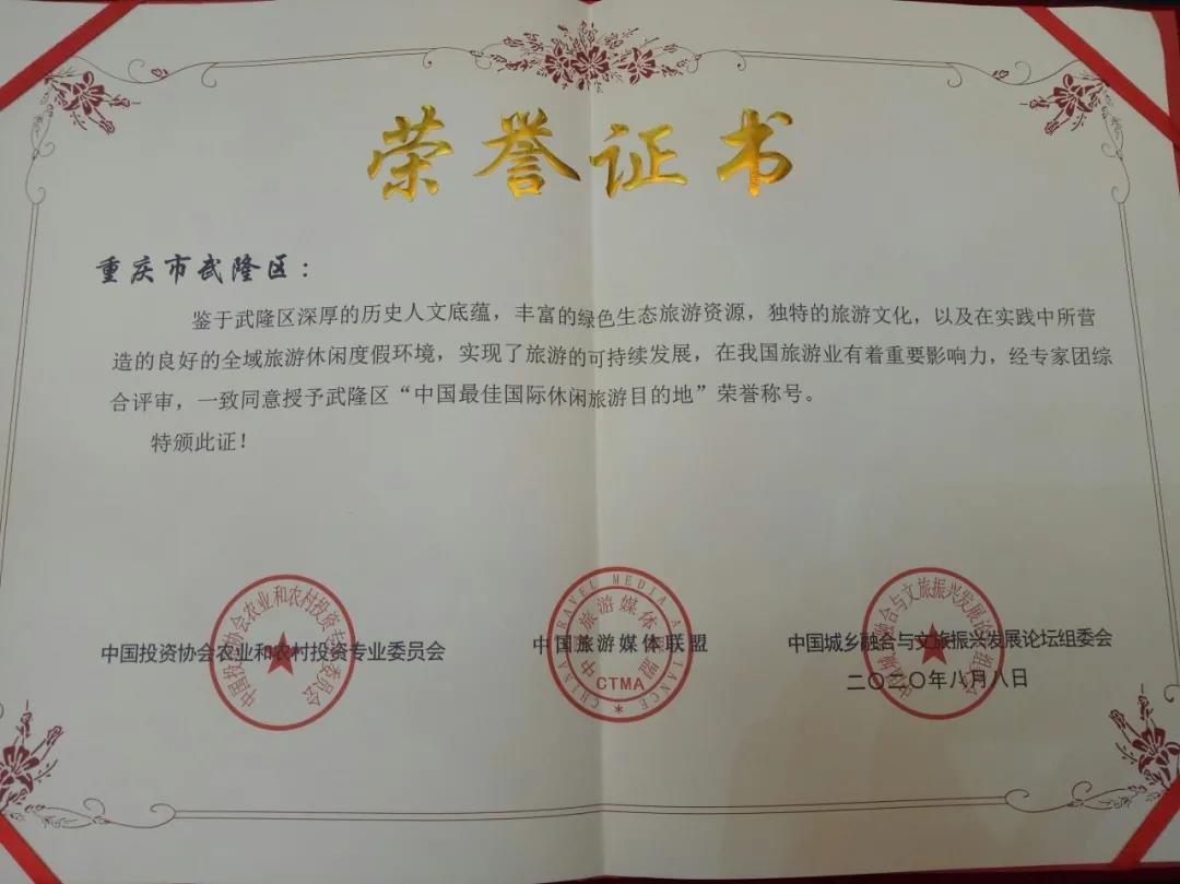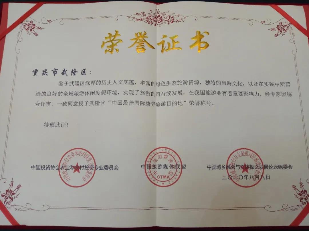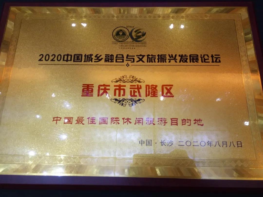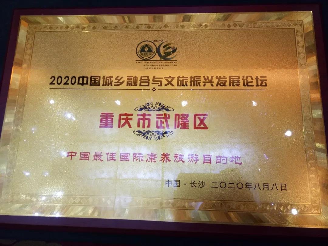 武隆区荣获由中国投资协会农业和农村投资专业委员会、中国旅游媒体联盟、中国城乡融合与文旅振兴发展论坛组委会联合颁发的“中国最佳国际休闲旅游目的地”、“中国最佳国际康养旅游目的地”,武隆国际山地户外运动公开赛荣获“中国最具特色文化旅游节庆”奖。